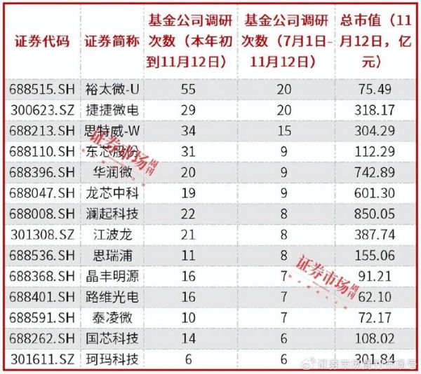 从半导体行业基金积极调研的公司来看,裕太微-U、思特威-W、东芯股份、华润微、龙芯中科、澜起科技、江波龙等公司也存在上半年调研次数高于下半年的情况(见表3)。从接受6次以上的被调研公司当前市值来看,市值最小的是路维光电,为62.10亿元;最高的是澜起科技,为850.05亿元。这些市值规模的公司在半导体行业处在中等位置。