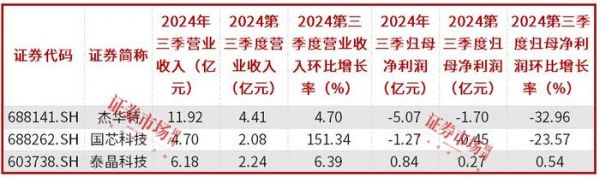 泰晶科技是上述三家公司中唯一保持盈利的公司。据公司三季报,公司前三季度营业收入为6.18亿元,同比增长3.69%;归母净利润为8441.97万元,同比增长12.25%,基本每股收益0.22元。在第三季度,公司归母净利润为2702.98万元,同比下降3.87%,环比增长0.54%(见表1)。