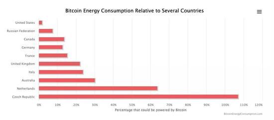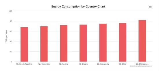 除了横向比较之外,我们还可以将比特币网络的电力消耗与全球能耗最高的几个国家进行比较,结果如下所示: