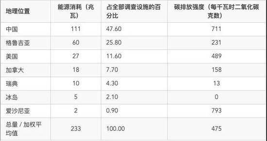下表列出了由 Hileman 与 Rauchs 在调查报告中整理出的采矿设施能耗细分结果。通过与国家 / 地区电网排放因子相对应,我们发现比特币网络的加权平均碳排放强度为每千瓦时 475 克二氧化碳。(目前这一数字也被广泛用于根据比特币网络的电力消耗指数,确定网络整体的碳足迹水平。)