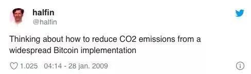 应该考虑控制比特币蔓延以减少二氧化碳排放。— halfin (@halfin) 2009 年 1 月 27 日