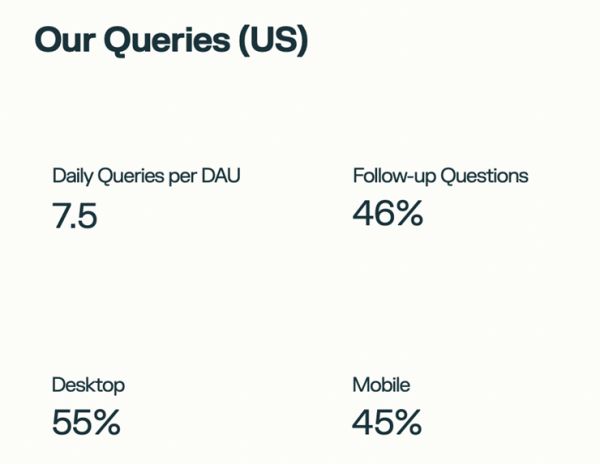 其次,用户量。从Similar Web的数据来看,Web端周访问量在1600万~1900万之间,月访问量在7200万左右。而移动APP端,根据Perplexity提供给广告商的Pitch Deck,8月份累计下载量为200万次,Daily Queries per DAU为7.5次,结合月搜索查询量数据,粗略推断其DAU为170万左右,其中55%的DAU属于web活跃用户,45%用户活跃在移动端。