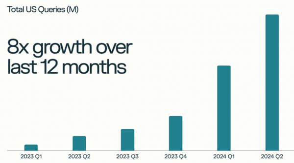 首要指标是搜索查询量。据报道,2024年8月份Perplexity每月处理约2.3亿个搜索查询,到了10月份每月处理查询量增长到了4亿次,过去12个月内Queries量增长了8倍。