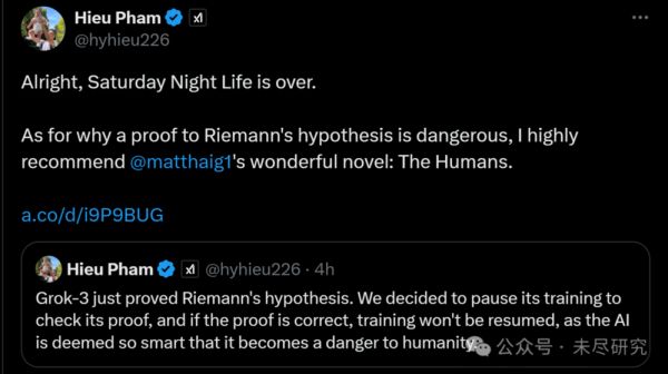 “Grok-3刚刚证明了黎曼猜想。我们决定暂停它的训练以验证其证明,如果证明是正确的,那么训练将不会恢复,因为这个AI被认为聪明到足以成为对人类的威胁。”