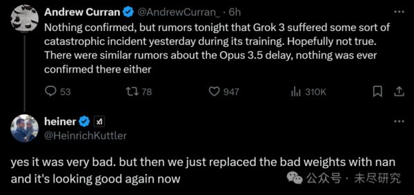 但是,又有传闻,Grok 3的训练之所以停下来,是因为出现了一次严重的事故。据库伦(Andrew Curran)在X上透露:“今晚有传言称,Grok 3在昨天的训练过程中遭遇了某种灾难性事件。希望这不是真的。关于(Claude)Opus 3.5延迟也曾有类似的传言,但当时也没有得到确认。”