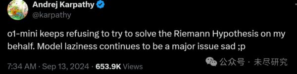 在推理模型o1发布后,不少人想尝试用它证明黎曼猜想,如AI大神卡帕西(Andrej Karpathy),抱怨o1 mini总是拒绝求解黎曼猜想,是典型的大模型“躺平”。