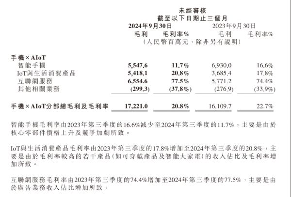 不过来自手机的毛利却减少了。三季度,小米智能手机毛利从69.3亿元下滑到了55.47亿元。毛利率同比下滑接近5个百分点,为11.7%。在收入占比高达45.3%的情况下,小米的智能手机毛利已经被互联网服务超过,只比AIoT业务多了1.3亿元左右。