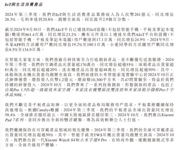 AIoT的另一块增长来自可穿戴设备,三季度,小米全球可穿戴产品出货量同比增长超过50%,收入同比增长40.2%。小米的耳机、手表、手环在小米SU7品牌力的带动下,越来越受到消费者的欢迎。