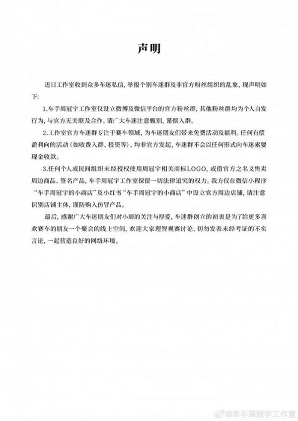 1.车手周冠宇工作室仅设立微博及微信平台的官方粉丝群,其他粉丝群均为个人自发行为,与官方无关联及合作。请广大车迷注意甄别,谨慎入群。