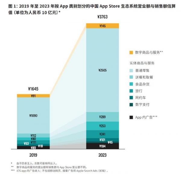 报告写道,从2019年到2023年,Apple App Store生态系统在中国促成的开发者营业额和销售额从1.65 万亿元增长到了3.76万亿元,其中超过 95%完全归各种规模的开发者和企业所有,无需支付苹果任何佣金。