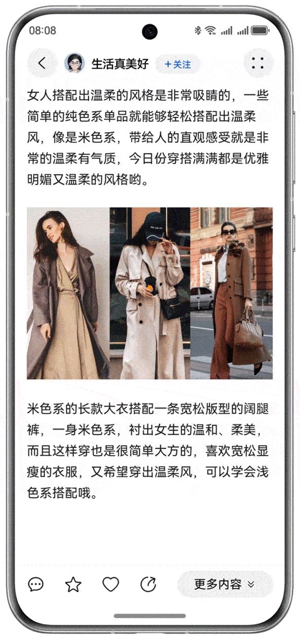 而圈选操作的存在,让这种功能体验变得更加日常和自然。比如你在火车上看电影或浏览资讯的时候,某个演员不认识,圈出来问小艺该演员是谁;看到社交媒体上的穿搭推荐,圈选出来问问小艺搜同款;路过一条文化古街,拍照后想了解照片中某个古建筑的由来,也完全可以圈选出想了解的建筑,小艺会精准识别你选中的部分,给出专业回答。