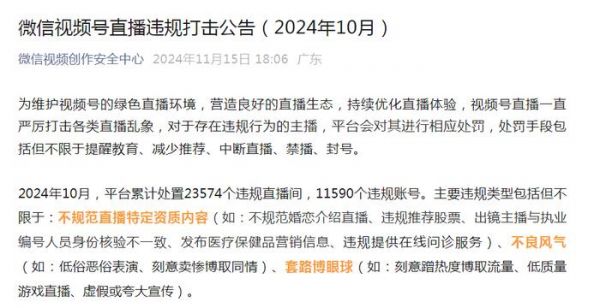 日前,“微信视频创作安全中心”微信公众号发布《微信视频号直播违规打击公告(2024年10月)》。公告显示,10月,平台累计处置23574个违规直播间,11590个违规账号。