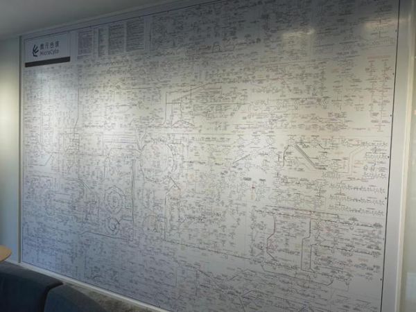 微元合成办公区的入口,有一幅巨大的细胞代谢图,密密麻麻的分子结构写满了一整面墙。“吃的包子、馒头,怎么转化为身体组织的一部分,就是通过代谢。”刘波说。