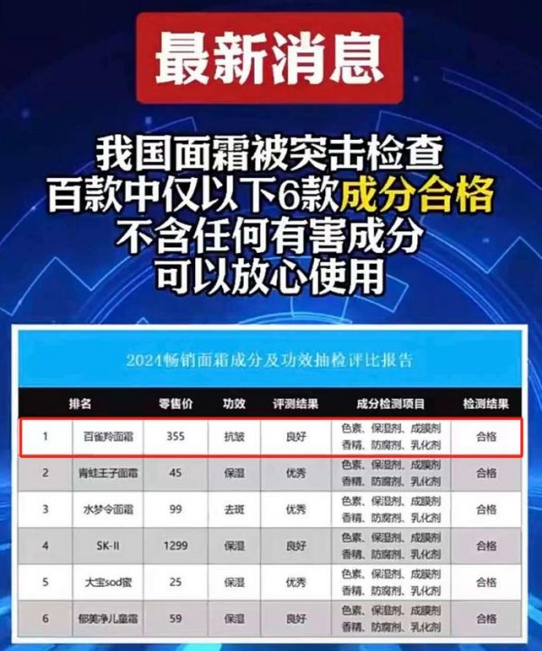 毕竟百雀羚是唯一一个挤进全球护肤品牌15强的国货!也是在突击检查百款中成分合格的品牌。
