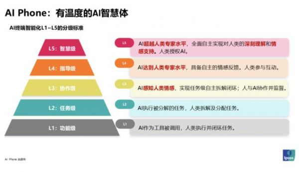 11月15日,市场研究机构益普索Ipsos发布了《AI Phone白皮书》,研究显示,“连接”、“效率”、“安全”、“情感”和“个性”,是消费者们使用智能手机AI功能的核心诉求,也是AI Phone在进行产品定义特别是功能价值定义时的主要出发点。除此之外,《白皮书》还针对AI终端智能化水平提出了L1-L5的分级标准,其中:
