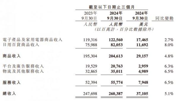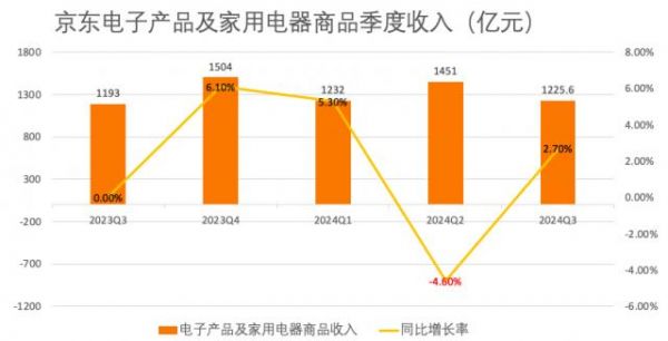 按另一分类来看,第三季度,京东商品营收2046.13亿元,同比增长4.8%。其中,电子产品及家用电器商品营收为1225.60亿元,与2023年同期的1193.16亿元相比增长2.7%;日用百货商品营收为820.53亿元,与2023年同期的759.88亿元相比增长8.0%。