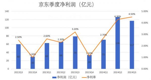 2024年第三季度,京东净营收2604亿元,同比增长5.1%;归属于普通股股东的净利润为117亿元,同比增长47.8%,净利润率为4.5%,而2023年同期为3.2%。
