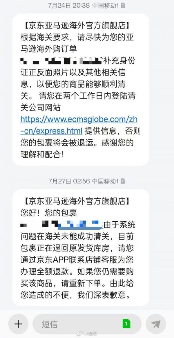 7月24日中午下单后,当晚便收到短信要求补充身份证及其他相关信息以便清关。在按照要求操作后,7月27日又收到短信称,订单由于系统问题在海关未能清关,包裹正在退回原发货库房,需要通过京东App联系店铺客服办理退款。