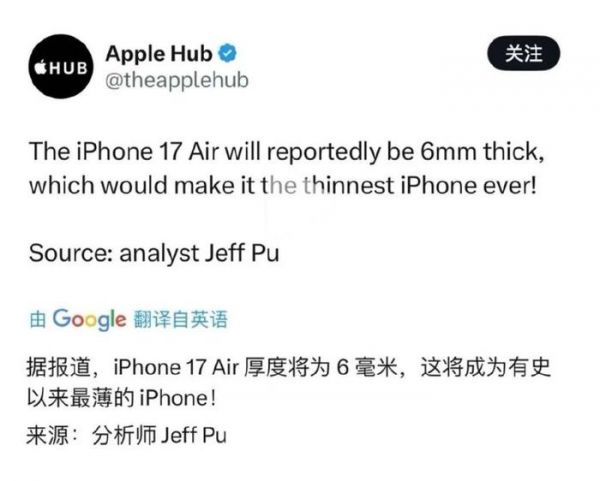 至于iPhone 17 Air机身厚度的具体数值,最近有了更详细的爆料。苹果分析师Jeff Pu在最新研究报告中透露,iPhone 17 Air的厚度约为6毫米。
