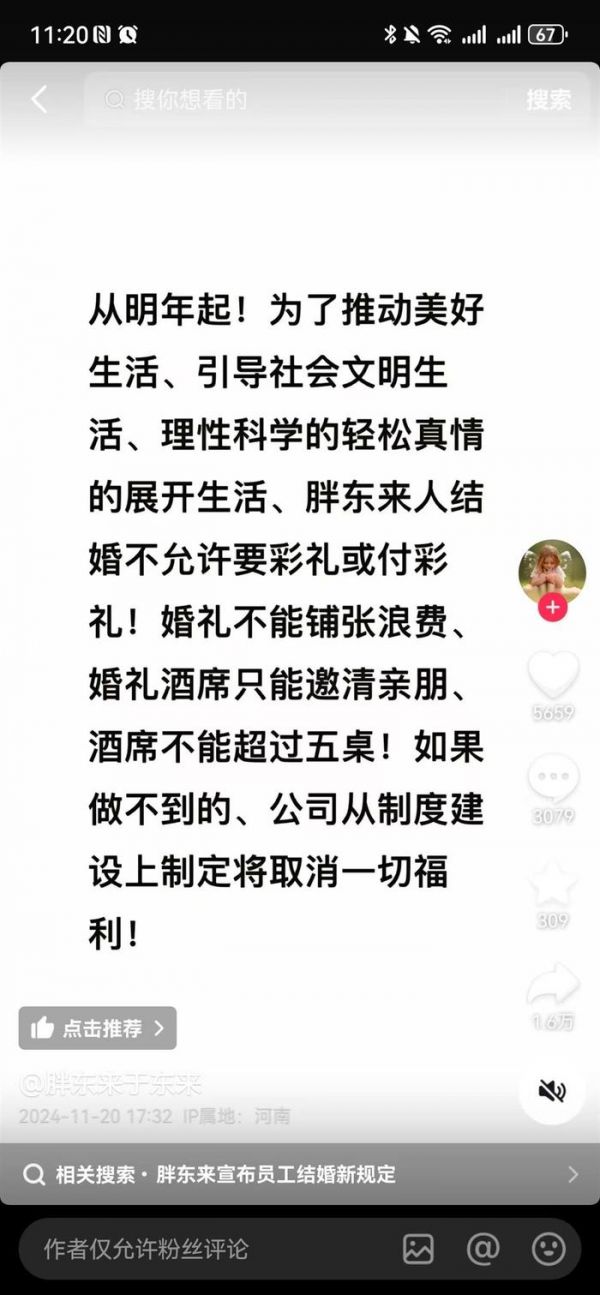 20日下午,于东来短视频社交账号“胖东来于东来”发文称,从明年起,为了推动美好生活、引导社会文明生活、理性科学的轻松真情的展开生活,胖东来人结婚不允许要彩礼或付彩礼!婚礼不能铺张浪费,婚礼酒席只能邀请亲朋,酒席不能超过五桌!如果做不到的、公司从制度建设上制定将取消一切福利!该文还写到,未来的胖东来人不允许靠父母买房买车!完全有能力靠自己主宰创造和享受美好人生。