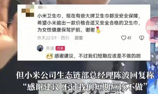 #小米高管回应网友催产卫生巾# 网友喊话雷军生产卫生巾?小米高管回应:我们短期应该是不做的。