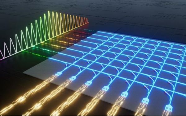 光计算芯片的核心是用波导来代替电芯片的铜导线,来做芯片和板卡上的信号传输,通过光在传播和相互作用之中的信息变化来进行计算。与电芯片相比,光计算架构在速度、带宽和能效上优势突出。据相关数据测算,理想状态下光芯片的功耗仅为电芯片的10%,延迟只有其1%,而算力却能达到电芯片的100倍以上。