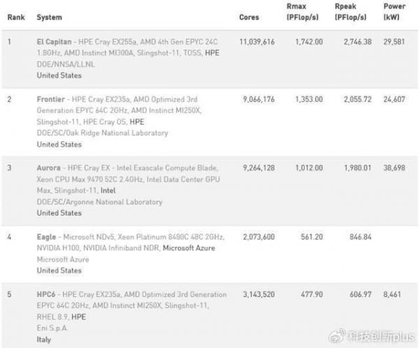 第一名的峰值性能是1.742 exaflops,是美国的,第二名的峰值性能是1.353exaflops,也是美国的,第三名是1.012exaflops,还是美国的。第四名也是美国的。