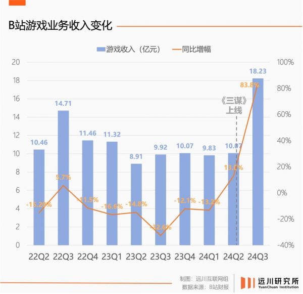游戏业务也在财报里扬眉吐气,今年二季度,《三谋》只贡献了20天流水,就让游戏营收重回10亿门槛;三季度《三谋》预估流水高达15亿 [2],B站游戏业务收入创下历史新高。