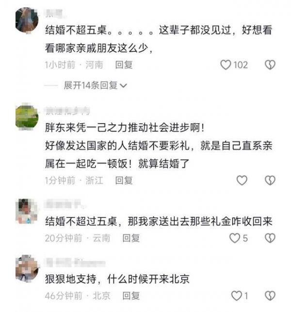 对此,有网友评论:“结婚不超五桌,哪家亲戚朋友这么少”“狠狠地支持”“胖东来凭一己之力推动社会进步”……