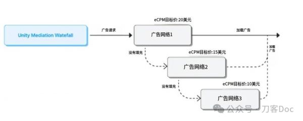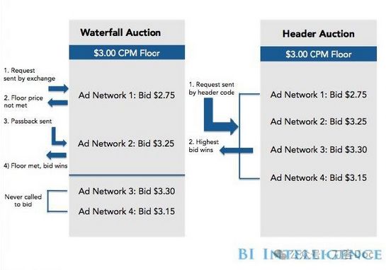 在此之前,广告询价的过程是瀑布流模式:媒体发出广告请求后,会依照广告网络(AD Network)的权重从上到下一一进行请求,如果权重更高的广告平台无法填充广告,就会向下传导,询问权重更低的广告来获得填充广告位。