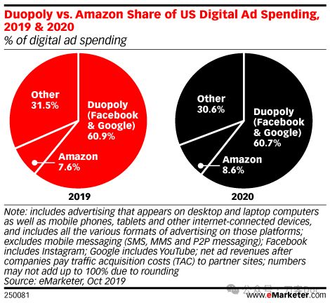 巨头的合作加速了广告市场的两极格局。2019年,谷歌和Facebook占据了60%以上的数字广告支出,双寡头垄断(Duopoly)正式形成。