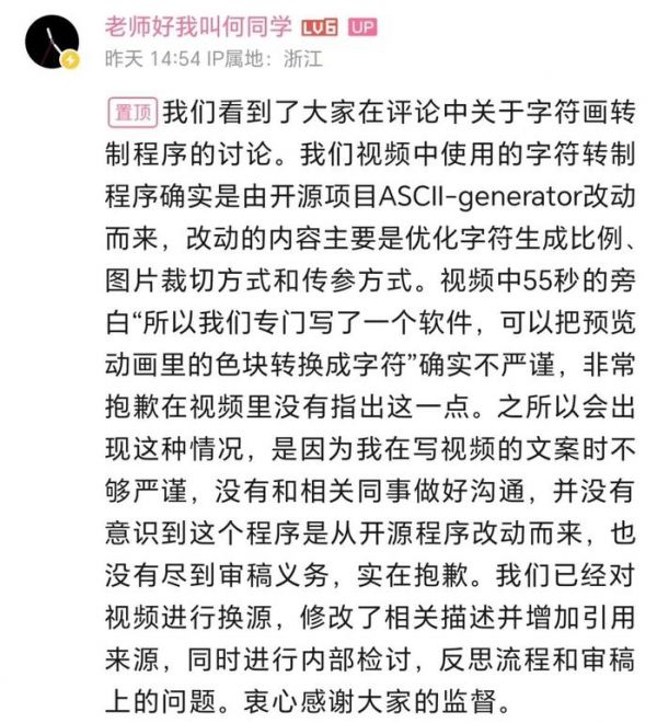11月19日下午,何同学在该视频评论区致歉并且回应了质疑,承认了这款软件确实是“从开源程序改动而来”,并解释称这是在与团队成员协作过程中出现的失误,导致了文案和旁白的不准确。随后他对视频内容进行了更新,修改了相关描述,并增加了对开源项目的引用。