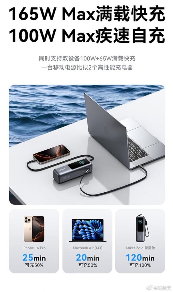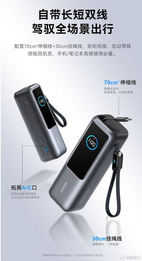 Anker Zolo 系列第二款产品 —— Anker Zolo 能量商舱移动电源,关键词 499 元。不对,关键词是 25600mAh 容量,165W 总输出功率,带屏幕可显示实时功率。更夸张的,是这玩意在自带 1A1C 双接口的情况下,再带伸缩线以及挂绳线,也就是合计 3C1A!