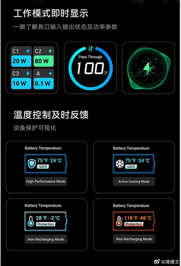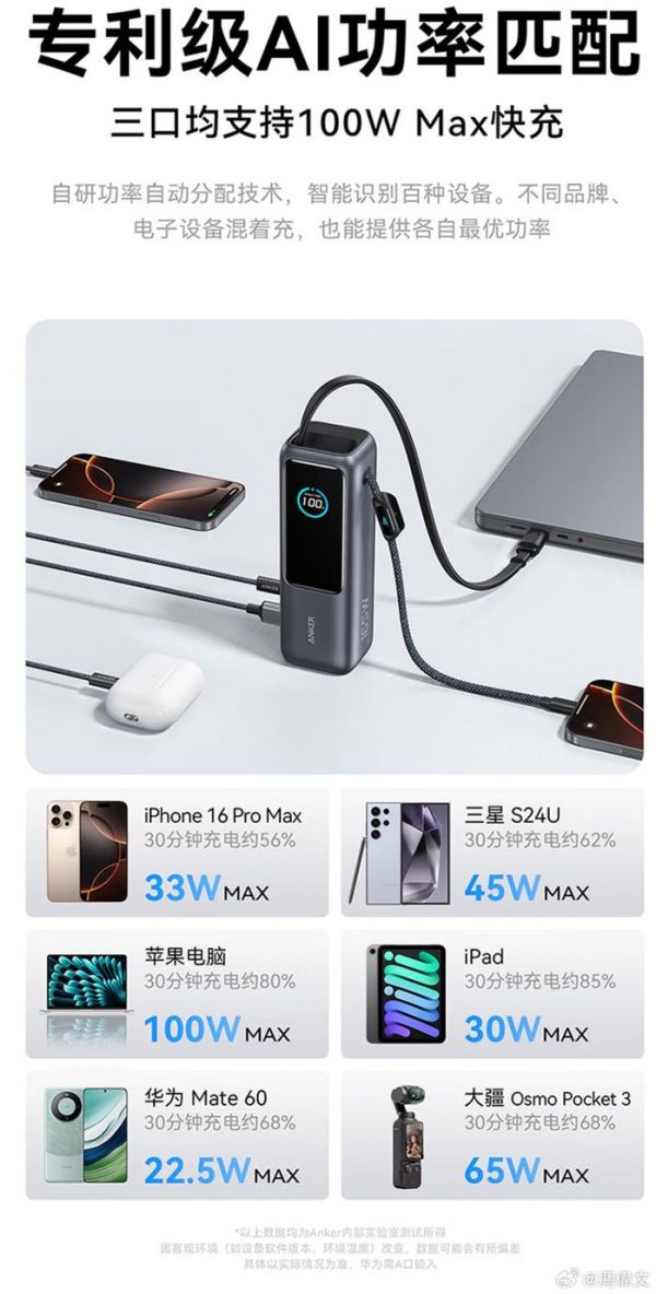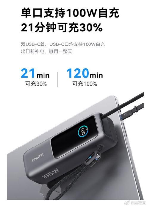 更窎的是这三个接口/线都是单口输出 100W ,堪称盲充都满速。两个 C 口同时用的话,也可以给到 100W+65W,给两个笔记本快速充电都没问题。甚至...这三个 C 口都可以给移动电源自己 100W 充电,真滴舒服。