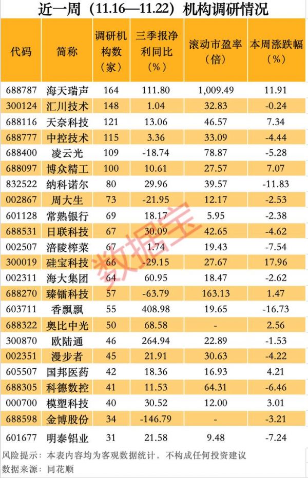 近一周机构调研个股数量有360多只,海天瑞声成为调研机构数量最多的股票。