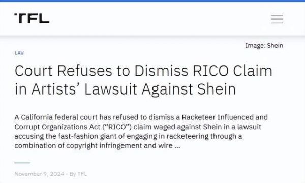 https://www.thefashionlaw.com/court-keeps-rico-claim-against-shein-in-play-in-algorithmic-infringement-lawsuit/https://www.reuters.com/business/retail-consumer/uk-lawmakers-could-question-shein-over-workers-rights-early-next-year-2024-11-04/https://www.retaildive.com/news/shein-class-action-lawsuit-copyright/712910/https://www.sohu.com/a/753500969_250147https://spectrum.ieee.org/midjourney-copyrighthttps://www.cnn.com/2023/07/14/business/shein-rico-lawsuit/index.htmlhttps://fortune.com/2024/04/16/shein-class-achttps://fortune.com/2024/04/16/shein-class-action-lawsuit-copyright-infringement-data-scraping-ai-art-alan-giana-china/