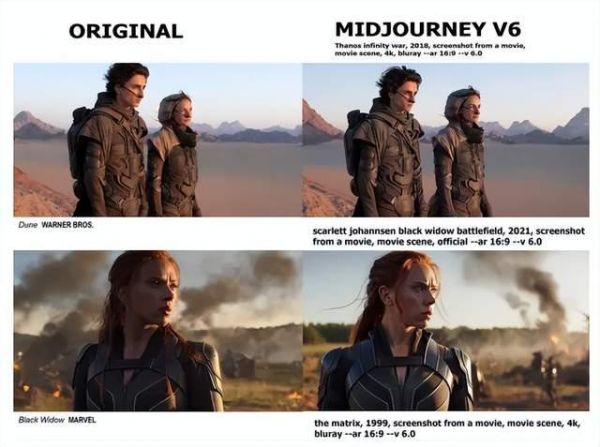 图:Midjourney生成图像与电影视频镜头雷同为了研究相关现象,AI科学家加里·马库斯(Gary Marcus)与电影概念艺术家里德·索森(Reid Southen)进行了实验,并整理成文章,于2024年1月发表在在工程和科学杂志IEEE Spectrum上。该文章指出,Midjourney 和 DALL-E 3 的实验显示存在版权雷区,他们能生成与原作品相似画面,卡通、动画、真实场景都能无差别复制。