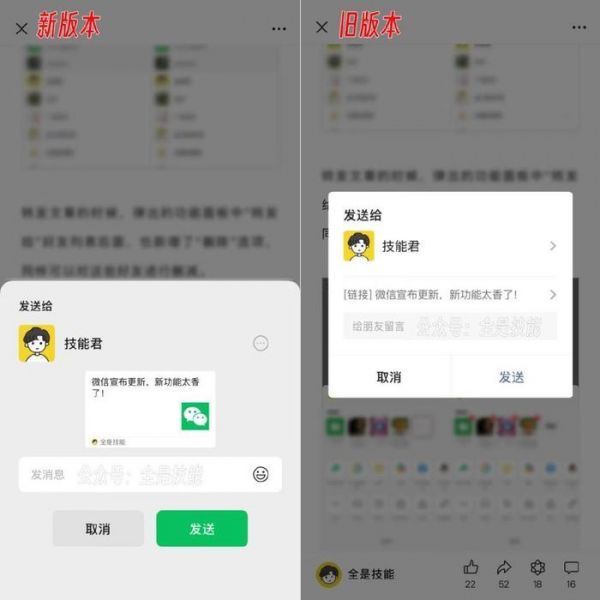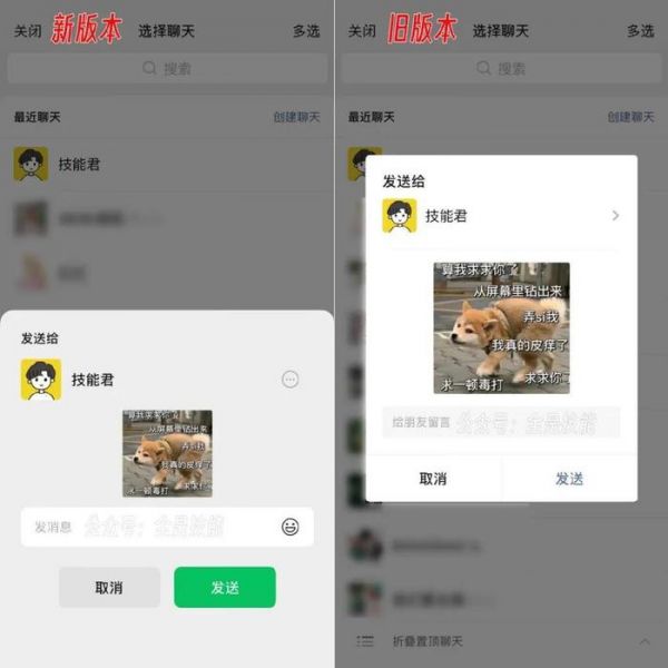 此外,有部分用户在更新微信后还发现,转发消息的界面也做了改版,显示方式由“居中弹窗”改为由底部弹出“半屏页面”,发消息的提示字样和发送/取消按钮也做了优化。