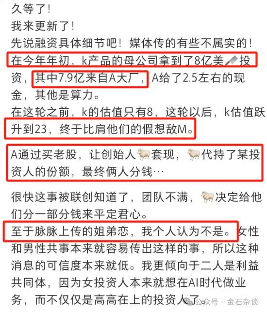 1)杨植麟是否代持,两人是否套现?根据小作文,在2024年2月这笔10亿美元融资中,创始人杨植麟套现,而套现的是代持张予彤的股份,事后两人分钱。而暗涌采访金沙江人士,也怀疑有代持。