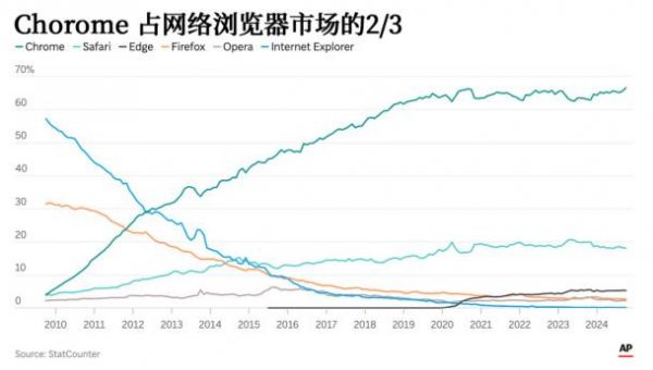 谷歌控制着大约90%的在线搜索市场,而作为将谷歌搜索呈现在互联网用户面前的关键手段的Chrome则控制着超过50%的美国浏览器市场。