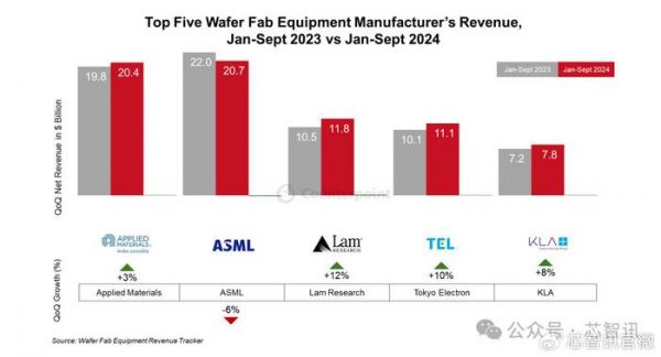 具体来说,今年前三季度的晶圆制造设备市场的营收同比增长了3%,其中仅ASML出现了同比6%的下滑,相比之下泛林集团同比增长了12%,东京电子同比增长10%,科磊(KLA )同比增长8%,应用材料同比增长了3%。前五大晶圆制造设备供应商的整体服务收入同比增长了7%,这有助于其净收入的增长。