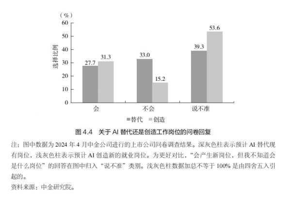 关于AI对就业的整体影响,现有研究存在针锋相对的不同观点。部分研究认为AI和自动化技术会导致较高失业率,多项研究估计 14%~56% 的现有工作存在被自动化的高风险。然而,另一些研究则认为AI会带来就业增长,因为AI能通过提高效率和促进产业升级等途径创造就业机会,其创造就业机会的效应足以抵消替代劳动力的效应。世界经济论坛的企业调查数据显示,约 50% 的企业预计AI将创造就业机会,只有 25% 的企业预计 AI 会减少就业机会。