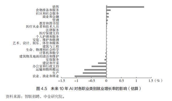 将各职业的净就业影响按其在中国总就业中的占比进行加权平均,即可得到 AI 对总就业的影响。我们的估算显示,AI 可能导致中国未来 10年的累计就业增长率比基准水平低 1.8 个百分点,年就业增长率平均降低约 0.18个百分点。对比我国庞大的就业人口和劳动力数量,这一数字带来的影响并不显著。这意味着 AI 本身在未来 10 年内并不会导致大规模失业。