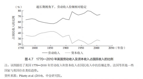 然而,如果我们把视线拉长,过去 200 多年间的劳动收入份额变化更多呈现周期性,而没有明显的线性上升或下降趋势(见图 4.7)。这提醒我们在分析劳动收入份额变化时应有一个全面且动态的视角,过去几十年间劳动收入份额的下降固然是现实问题,但我们并不能由此得出其趋势会长期延续的判断,更无法直接推出技术进步等因素会使得劳动收入份额跌至零的极端结论。