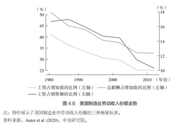 一项基于美国行业数据的研究发现,劳动收入份额的下降主要发生在行业内部,特别是在制造业和贸易行业;因此,将劳动密集型的供应链外包可能是美国劳动收入份额下降的一个关键原因。一项基于欧洲行业数据的研究也发现,资本深化和部门就业结构的变化是导致欧洲劳动收入份额下降的主要因素。近期的一些研究开始关注技能偏向型技术进步(skill-biased technical change, SBTC)对劳动收入份额的影响,指出其可以解释美国制造业部门 1970—2010 年劳动收入份额下降程度的 20%。上述研究描述和解释了过去几十年间劳动收入份额的下降趋势,特别是在制造业等行业(见图 4.6)。
