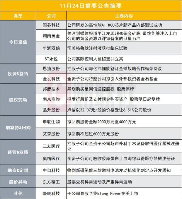 ST 永悦公告,公司于 2024 年 11 月 24 日收到控股股东江苏华英发来的实际控制人陈翔的留置通知书和立案通知书。陈翔未在公司担任任何职务。公司将按照相关法律法规和制度规范运作。目前,公司董事、监事和高级管理人员均正常履职,公司控制权未发生变化,董事会运作正常,生产经营情况正常,上述事项不会对公司正常生产经营产生重大影响。公司将持续关注上述事项的后续情况,并及时履行信息披露义务。