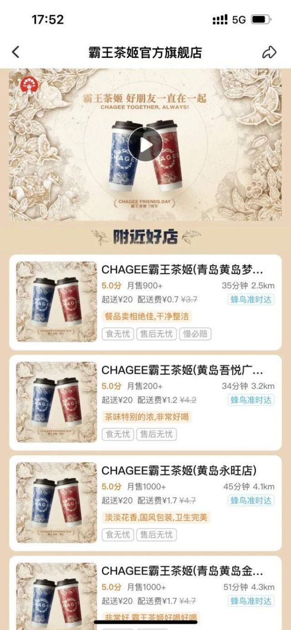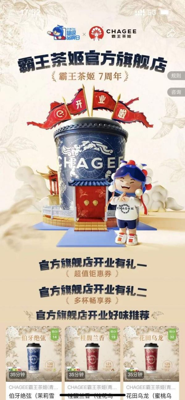 11 月 20 日,霸王茶姬在饿了么上的官方旗舰店上线,这是饿了么在餐饮领域的首个合作官旗店。