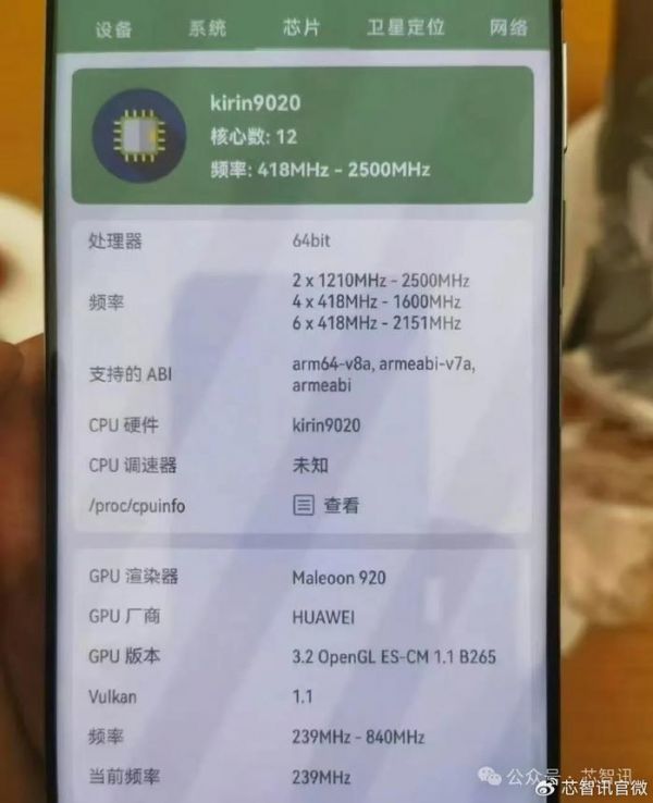 检测数据显示,麒麟9020是一款12核心处理器,拥有2个2.5GHz主频的大核,6个2.15GHz的中核,4个1.6GHz的小核。GPU为Maleoon 920,频率840MHz。