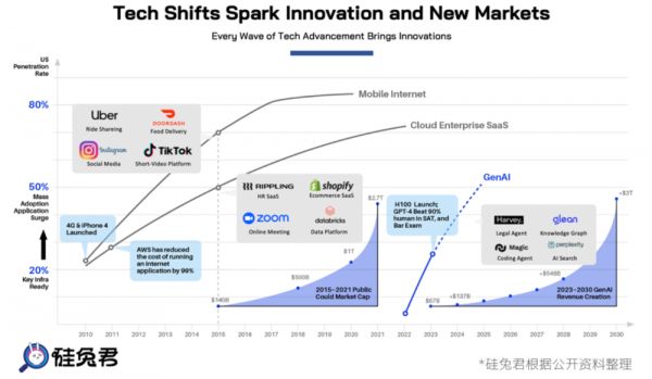 每⼀波技术浪潮中基础设施完善后的5年内,是应⽤公司成长的黄金期,不少百亿级、千亿级市值的企业都诞生于这一阶段。