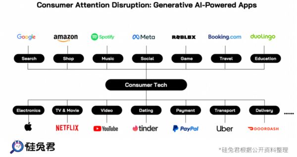 无论哪一类,生成式AI应用公司的快速成长,必会对传统行业的业务造成一定冲击。哪些消费级科技巨头最容易被AI升级取代?哪些创企有机会在技术变革的风暴中一跃而上,成为新的百亿级、千亿级别的企业?我们从现有消费科技市场出发,探索出几个赛道,最有机会在GenAI有大幅增长的空间,甚至能够被GenAI取代。